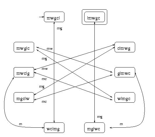 (mwgc|) - (wc|mg) - (mwc|g) - (w|mgc) - (wmg|c) - (g|mwc) - (mg|wc) - (|mwgc)