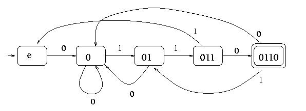 So here is what we do. We design a little finite automaton that will enter a designated state (in which the red button gets pushed) whenever the last four digits are 0110. The idea behind this automaton is quite clever. Each state corresponds to the longest prefix of 0110 that is also a suffix of the bit stream received so far. (Please read the previous statement aloud three times before proceeding.) We allow an empty string that we denote l. So there are four possible prefixes: l, 0, 01, 011, 0110. The trick is now that we can determine the transitions between them without considering the actual bit stream.