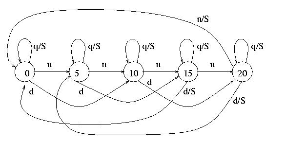 So our automaton will have states corresponding to the current credit: 0, 5, 10, 15, 20, and transitions labelled by n (nickel), d (dime) and q (quarter). For example, from 0 we have a transition to 10 labelled by d. What is the transition from 15 on d? After receiving a dime, the credit is 25 cents, so we will dispense a soda and the credit becomes 0. Thus we get a transition from 15 to 0 labelled by 10/S. The "10" is the input symbol (action) and the "S" is the output symbol (or output action -- dispensing a soda) that corresponds to this transition. Here is the complete automaton.
