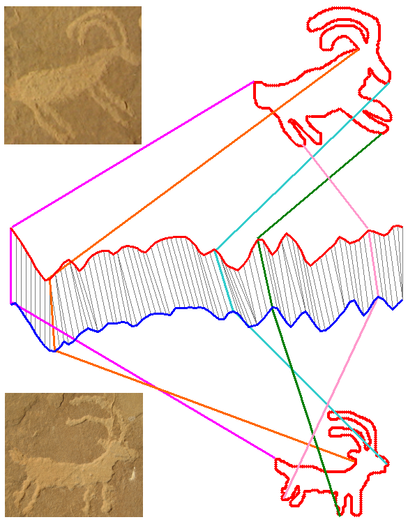The petroglyph labeled "Red Rock 3" was used as a query in a database of several hundred petroglyphs from the Southwest of the US, the five best matches are shown clustered in a dendrogram. The best match is from some Kawaiisu petroglyphs at Sheep Springs. The second best match is from the same location in Red Rock (look under Eamonn's left hand), the next 3 matches come from Renegade Canyon. Note that while the images are presented in their original orientation, the indexing algorithm is "mirror image invariant". The image to the left is an example of how the petroglyphs are matched, using Dynamic Time Warping (DTW). Note that the feature extraction algorithm does not do a perfect job at extracting the shape, but DTW can account for this.