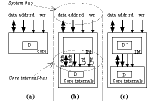 The architecture for the Core1 situation is shown in Figure 3(a), showing one register D and its corresponding pre-fetch register D'. Since D is only updated by the system bus, no pre-fetch unit is needed; instead, we can write to D' whenever we write to D. Such a lack of a PFU is an exception to the normal situation. Figure 3(b) shows the architecture for the Core2 situation. The data output register DO and status register S both have pre-fetch registers in the IM, but the data input register DI does not since it is never read by the system bus. The PFU carries out its pre-fetch heuristic (see next section), unless the controller asserts the "writing" line, in which case the PFU suspends pre-fetching so that the controller may write to DI over the core internal bus. Figure 3(c) shows the architecture for the Core3 example, which has no write-access registers and hence does not include the bus between the controller and the core internal bus.
