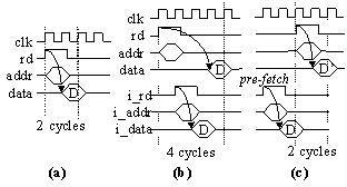 Figure 3 shows timing diagrams for the three cores with an IM and pre-fetching. In all three cores, the read latency for each core with an IM and pre-fetching was equal to the latency of that core without an IM, thus eliminating the performance penalty.