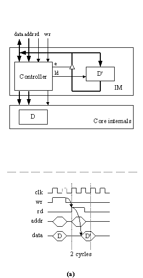 Separating a core's interface behavior and internal behavior can lead to performance penalties. For example, consider the core architectures shown in Figure 1(a), (b) and (c), respectively showing a core with no IM, a core with an IM but without pre-fetching, and a core with an IM with pre-fetching. The latter two architectures are similar to that being proposed by the VSIA. The IM interfaces with the system bus, whose protocol may be arbitrarily complex, including a variety of features like arbitration. The IM also interfaces with the core internals, over a core internal bus; this bus is typically extremely simple, implementing a straightforward data transfer (and it is this internal bus that the VSI On-Chip Bus group is standardizing). Without an IM, a read of a core's internal register from the system bus may take as little as 2 cycles, as shown in Figure 2(a). With an IM, the read of a core's internal register may require 4 cycles, 2 from the internal module to the IM, and 2 from the IM to the bus. Thus, a read may require extra cycles compared with a core whose interface and internal behavior was combined.